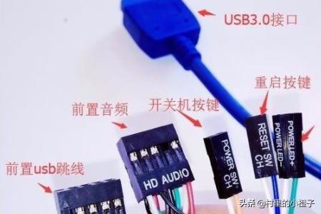 POWER SW=开机键,POWER LED=开机指示灯(有正负极区别),RESET SW=重启键,H.D.D LED=磁盘指示灯(有正负极区别),HD AUDIO=高保真音频,USB(一般不注明指的是2.0)
