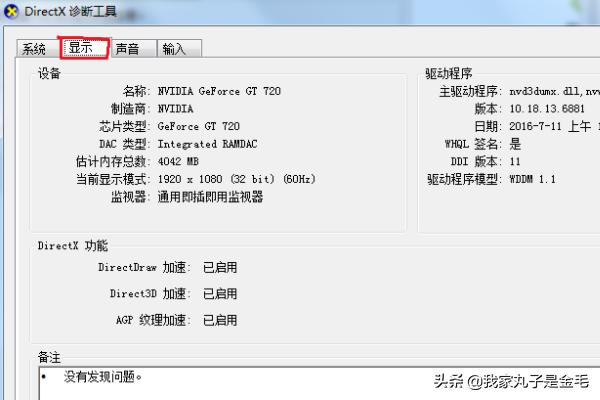 7、这时还弹出一个Directx诊断工具的界面,我们选择“显示”选项,此时我们就可以看到显卡的详细参数,包括显卡名称、制造商、芯片类型、内存等参数。