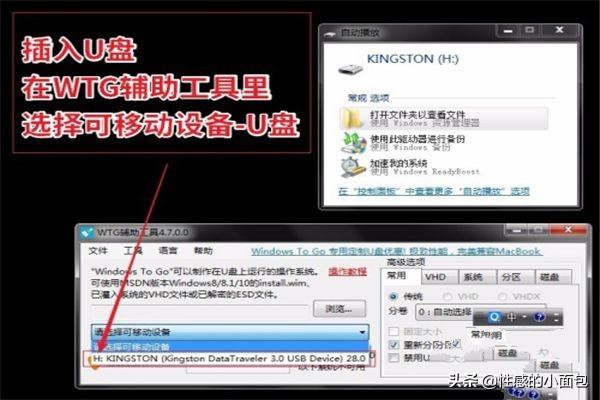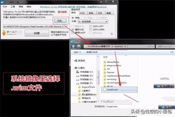双击 . EXE可执行文件,运行WTG辅助工具。插入U盘,在WTG辅助工具里将可移动磁盘选为U盘。单击浏览,选中系统镜像文件夹中-sources目录-install.wim。