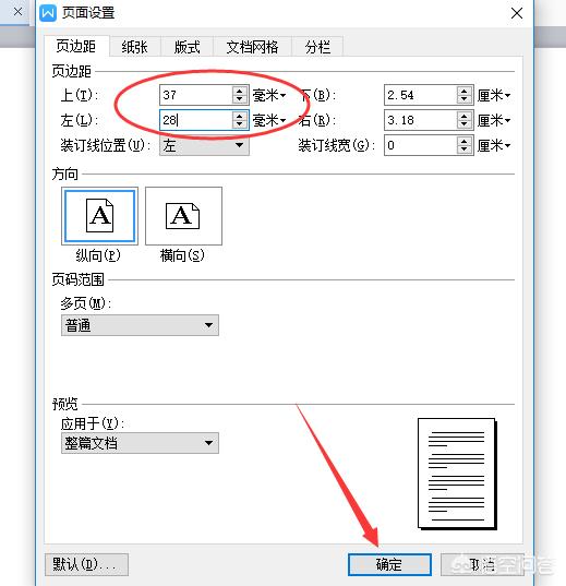 将页边距“上(T)”设置37mm、“左(L)”设置为28mm,点击“确定”