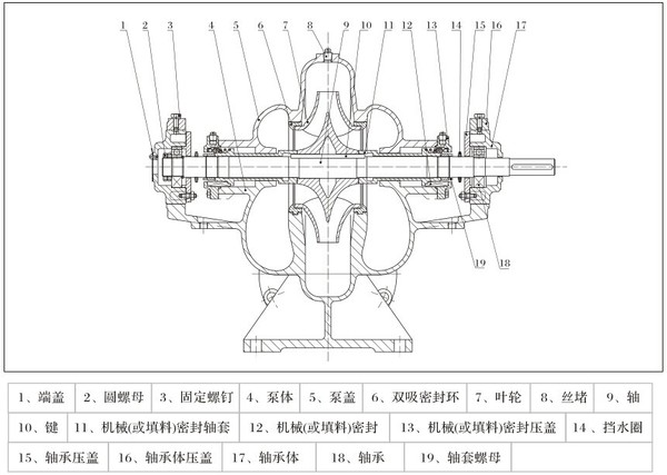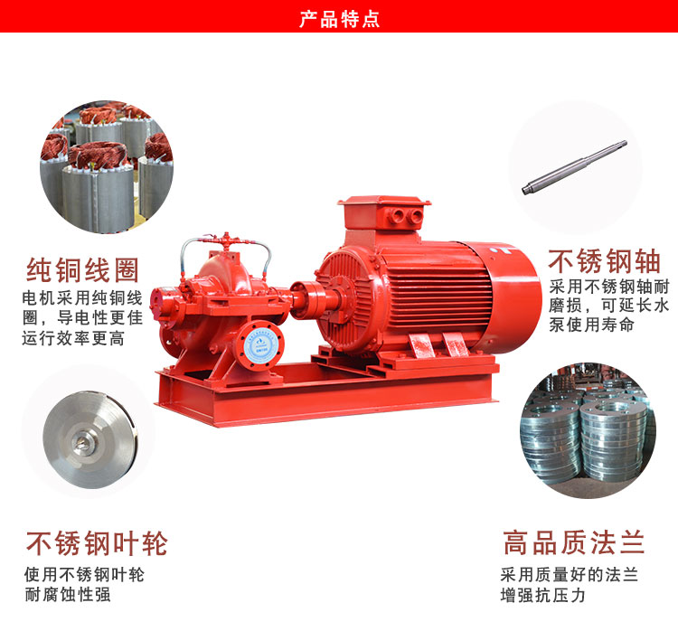 XBD-S单级双吸消防泵组为水平中凯结构型式,吸入口,吐出口均在水泵轴心线下方,与轴线垂直成水平方向,这种结构型式泵在检修时不需拆卸进出口管路,拆装检修极为方便。转子整体为一组合部件,可以整体吊装便于检修,同时同一转子部件可用于反向旋转。
