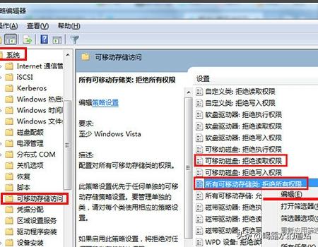 4、第四招:策略组方法 更换一个usb插口,然后使用组合键(win键+r)打开运行窗口,并输入“gpedit.msc”再点击“确定”按钮。依次点击“计算机配置——管理模块——系统——可移动存储访问”在右侧中找到“可移动磁盘:拒绝读取权限”和“所有可移动磁盘:拒绝读取权限”单击右键点击“编辑”选项: 接着在弹出的窗口中点击“已禁用”单选按钮,在点击“应用——确定”按钮。