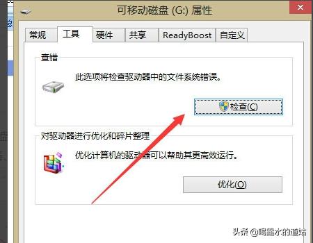 3、第三招:在u盘盘符上点击右键——〉属性——〉工具,点击”检测“。系统将检测并自动修复磁盘问题,当然也可能提示无任何问题,但是还是打不开u盘的问题。在老版本里,需要勾选检测时自动修复2个复选框。