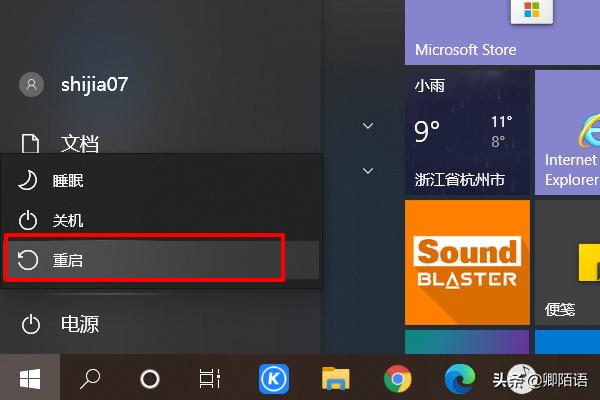 1、进入BIOS需要我们退出Windows系统,电脑的左下方找到电源,点击重启;