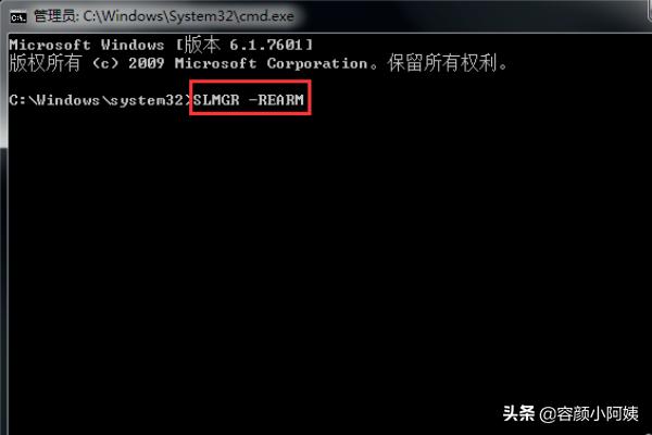 4、这样我们就进入了以下的界面,我们在该界面>后面输入SLMGR -REARM,大家注意下有个空格键。