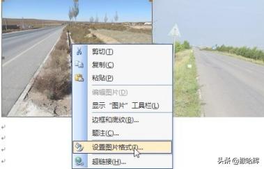 2、根据图片大小以及拟排列的情况,规划好每行显示图片的张数。以每行排列2张图片为例,单击鼠标左键来选择具体的图片→单击鼠标右键→在弹出的选项列表中点击“设置图片格式”。