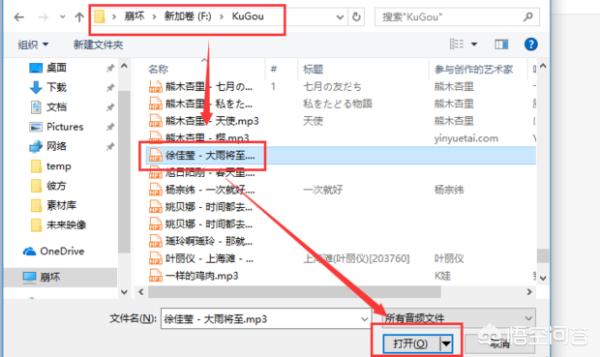 7、按刚才第3个步骤的歌曲的存储路径,找到这首歌,鼠标左键点击选中这首歌,然后点击下方打开;