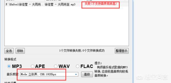 9、点击转换之后显示“失败”,这是因为选择了高品质音乐;