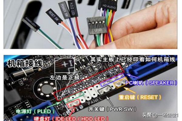 14、硬盘灯、电源灯、开机键、重启键 按照主板标示安装(彩色线正极,黑白线负极)
