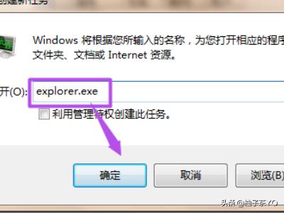 4、在出现的对话框中输入“explorer”,点击【确定】,稍等一下就会出现桌面图标了。
