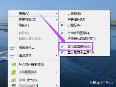 1、 解决:在桌面空白的地方鼠标右击,在出现的选择中,将鼠标放到‘查看’选项上面,在出现的子菜单中可以看到‘显示桌面图标’前面的勾是没有勾上的。