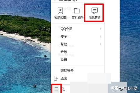 1、打开电脑上的QQ,点击登录账号和密码之后,在QQ界面中选择最下方“三条横线”,然后出现选项点击“消息管理”。