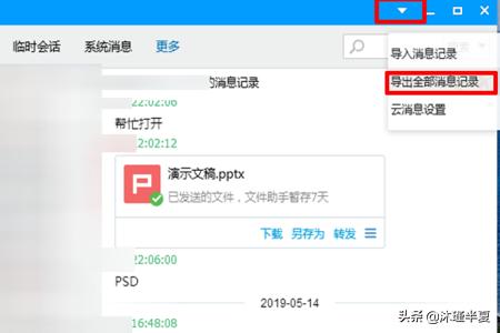 6、为了防止误删找不回可以点击“消息管理”中最右上方的“三角号”,如图所示点击之后点击“导出全部消息”。