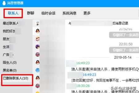 2、弹出消息管理器中点击“联系人”,可以选择已经“删除联系人”,选择你需要查看聊天记录就可以到被删除聊天记录。